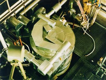 Wie aus der oberen Abbildung ersichtlich ist der Schmelzreaktor in Rohrbauweise gefertigt. Selbst nach über 5 Jahren Betriebszeit wurden keine Korrosionserscheinungen festgestellt. Die Kühlung erfolgt mit Kesselwasser. Der hieraus freigesetzte Sattdampf wird mit dem im Kessel aus der Abgaskühlung gewonnenen Sattdampf in einer Überhitzerstufe des Kessels auf 300 °C überhitzt. Mit dem überhitzten Dampf mit einem Druck von 26 bar wird eine Turbine beaufschlagt und ca. 1 MW Strom gewonnen.