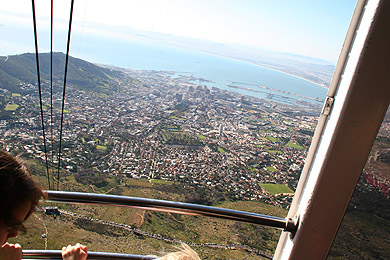Der Weg zur Talstation der Gondelbahn zum Tafelberg war schnell und problemlos gefunden. Kaum hatten wir einen Parkplatz gefunden, wurde uns die Visitenkarte (Laserdruck auf einfachem Papier mit einer Schere ausgeschnitten; aber so etwas Vornehmes haben wir danach nicht mehr bekommen) unseres Autoüberwachers in die Hand gedrückt. Die Fahrt mit der Gondelbahn war schon ein kleines Erlebnis - 700 m in sechs Minuten. Der Innenboden dreht sich während der Fahrt mehrmals um 360°. In einem Fensterabschnitt war kein Glas, so dass man während der Fahrt Bilder aus der Gondel ohne die sonst üblichen Glasspiegelungen schießen konnte. Vom Plateau aus hatte man natürlich den besten Blick über Kapstadt. Die Vegetation war - da Winter - naturgemäß nicht die blühendste. Dennoch machten wir einen ausgedehnten Spaziergang über das 1086 m hohe Tafelbergplateau.
