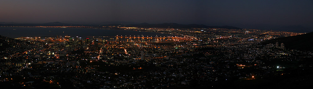 Nach erneuter Gondelfahrt suchten wir uns einen Supermarkt um Getränke, Knabbereien und sonstig Lebensnotwendiges für die nächsten Tage einzukaufen. Nachdem auch das erledigt war, fuhren wir zum Signal Hill auf der Suche nach einem guten Standort für Nachtaufnahmen. Da wir hier allerdings nicht richtig fündig wurden, bauten wir schließlich unser Stativ am Fuße der Gondelbahn-Talstation zum Tafelberg auf, um über die Dämmerung hin mehrere Fotosequenzen für Panoramaaufnahmen zu schießen.