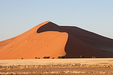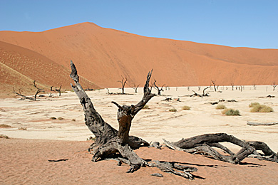 Vleis sind große Lehmsenken, die nur selten mit Wasser gefüllt sind. Die karge Pflanzenwelt holt sich die benötigte Feuchtigkeit vom Grundwasser herauf. Unregelmäßig führt der Tsauchab-Fluss Wasser bis in die Vleis hinein. Im Deadvlei stehen total vertrocknete Kameldornbäume, deren Alter auf 500 Jahre geschätzt wird. Um die Vleis herum befinden sich die angeblich höchsten Dünen der Welt. Die höchste direkt am Deadvlei wird "Big Daddy" genannt. Eine Kette von Unentwegten wagte auch in der größten Mittagshitze den Aufstieg. Wir verzichteten dankend und wanderten die 1,5 km zurück und dann noch 500 m weiter zum Sossusvlei. Neben einem einsamen Straußenpaar, das Sonnenschutz unter einem noch "lebenden" Kameldornbaum suchte, war noch die Masse der Spezies Homo sapiens, die meinte unbedingt ohne Schatten "Big Mamma" besteigen zu müssen, zu bewundern. Oder war sie zu bedauern?
