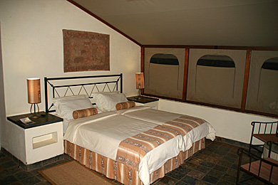 Das Abendessen war wieder genauso gut, unsere Portionen aber etwas geringer als am Vorabend. Der Reifen traf anstatt um sieben erst um Viertel vor neun ein. Während der Fahrer noch in der Nacht wieder zurückfuhr, um pünktlich zu Arbeitsbeginn in Windhoek zu sein, erklärte sich der Lodgemechaniker sofort bereit, seinen Fernsehabend zu unterbrechen und den Reifen aufzuziehen. Hätte es einen solchen Service in Westeuropa gegeben? Ich glaube nicht! Da wir am nächsten Tag vor Frühstücksbeginn nun ohne Sorgen zum Sossusvlei aufbrechen konnten, bestellten wir als Letztes ein Frühstück zum Mitnehmen. Die Antwort "wir machen Ihnen einen Korb" klang harmlos, so dass wir uns beruhigt schlafen legten.