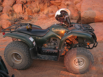 Inzwischen war der Nachmittag längst angebrochen. Es reichte aber gerade noch, um an der Eco-Quadbike-Tour von drei bis sechs teilzunehmen, zu der wir uns morgens angemeldet hatten, als wir noch glaubten, das Reifenproblem sei schnell gelöst. Die Fahrt ging wegen "Eco" nicht durch Dünen sondern durch hügeliges, zur Lodge gehöhrendes Gelände. Da wir beide aber zuvor noch nie auf so einem Ding gesessen haben, hat es uns auch so einen Riesenspaß gemacht. Natürlich war auch hier ein afrikanischer Sundowner mit von der Partie und wir konnten wenigstens noch etwas die Seele baumeln lassen.