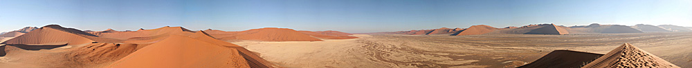 Die Aussicht von oben auf die Dünenlandschaft der Namib ist schon erhebend und war die Strapaze wert. Den Aufstieg haben wir natürlich über den Dünenkamm gemacht. Abwärts nahmen wir die Direktissima, was aber auch nicht so einfach war, da man leicht im tiefen Sand versank.