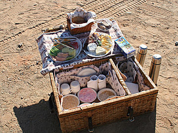 Also hatte ich mit Frauke abgesprochen, dass ich um halb sechs als Erster aufstehe, um möglichst vorne in der sich vor dem Tor bildenden Autoschlange zu sein. Im dahinter liegenden Nationalparkbüro bildet sich nämlich die nächste Schlange zum Entrichten der Eintrittsgebühr und sonstiger Formalitäten, was dann Zeit kostet. Frauke sollte sich dann in Ruhe fertig machen, das Frühstück abholen und die 500 m zum Tor zu Fuß nachkommen. Ich war auch tatsächlich um sechs als Erster am Tor. Schnell wurde hinter mir die Schlange länger, doch wer nicht kam war Frauke. Es kamen auch Autos aus der Lodge, aber ohne Frauke. Ich war schon unruhig geworden, als ich sie plötzlich übers Feld kommen sah, in jeder Hand eine Thermoskanne. Neben ihr wankte ein junger Lodgeangestellter, der mit steifgefrorenen Händen (wegen der morgendlichen Kälte) an ausgestreckten Armen einen 80x60x40 cm großen englischen Landpicknickkorb trug - unser Frühstück!!! Mir fiel die Kinnlade runter und nacheinander den Leuten in den nächsten Autos. Einer fragte ganz entsetzt: "Only for two?"
