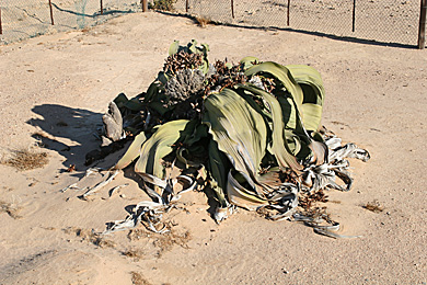 Sie ist nicht die schönste, dafür aber wohl die langlebigste und (neben den Köcherbäumen) bekannteste Pflanze Namibias, die Welwitschia mirabilis. Ihren Wasserbedarf deckt sie allein aus niedergehendem Nebel. Ein 1.500 Jahre altes Prachtexemplar ist am Ende des Drives zu bewundern. Üppiger ist die Vegetation im Swakop Rivier-Tal. Kameldornbäume und andere ziehen das Wasser aus dem Fluss, der unterirdisch verläuft. Geologisch interessant ist der Dolorit-Kamm. Flüssige Lava drang in einen Riss des älteren grauen Granitfelsens. Der schwarze Dolorit ist ein harter Fels, der langsamer als das übrige Gestein verwittert, so dass er sich wie ein schwarzes Band über die Hügelkuppen zieht. Desweiteren bilden die Täler des Swakops eine spektakuläre Mondlandschaft, die entstanden ist, als sich der Fluss durch die weicheren Oberflächenschichten hindurch fraß, die sich vor etwa 450 Millionen Jahren abgelagert haben, als noch ein feuchteres Klima herrschte. Etwas vermiest wurde einem das Ganze allerdings durch den sauschlechten Zustand des Drives. Nach 455 km erreichten wir dann Swakopmund gerade rechtzeitig zum Sonnenuntergang an der Jetty.