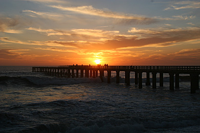 1912 wurde in Swakopmund die Landungsbrücke Jetty in den Atlantik hinausgebaut. Wegen des Kriegsausbruchs blieb sie unvollendet und wurde nie mehr richtig genutzt - es sei denn zum Angeln oder für romantische Promenaden in den Sonnenuntergang hinein. Direkt vor der Jetty an der Strandpromenade befindet sich in einem alten Schiffrumpf das Restaurant "The Tug". Hier hatten wir ja bei der Ankunft einen Tisch reserviert. Die Atmosphäre war urig, der bestellte Kingklip schmeckte sehr gut; dennoch hatten wir- ohne richtig sagen zu können warum - das Gefühl, dass es uns in einem anderen Restaurant besser gefallen hätte.