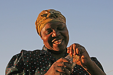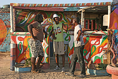Nach einem Besuch des Kristallmuseums fuhren wir zurück zum Intermezzo. Pünktlich um 15:00 Uhr holte uns dort Guide "Beetle" von Hata-Angu Cultural Tours zu einer Mondesa-Townshiptour ab. Mit von der Partie in Beetles klapprigen aber fahrtüchtigen PKW war noch Maria, eine Studentin aus Windhoek, die als Hilfsguide fungierte. Wir besuchten unter anderem die über 80-jährige Oma Lena, die zur Anführerin der Damara im Township gewählt wurde und die Medizinfrau Auguste. Neuankömmlinge müssen 2 Jahre in der DRC (Democratic Resettlement Community) 2 km vor Mondesa verbringen, ehe sie ein Grundstück und 4 x 5.000 NAD für ein zu errichtendes Steinhaus im Township bekommen. Hier treffen wir den Künstler Ernest Thaniseb, mit seiner Familie schon vor sechs Jahren in ein Steinhaus hätte ziehen können, doch er bleibt lieber in seinem bunt bemalten Holzverschlag. Hier empfängt er jetzt Touristen, verkauft ihnen selbstbemalte T-Shirts und bekommt auch noch etwas Geld von der Agentur; denn die Hälfte der Tourgebühren geht an. Obwohl es in der DRC weder Strom noch fließend Wasser gibt, besaß Ernest eine "Flushing Toilet" und es dudelte ein (Auto)-Radio, gespeist von mehreren Autobatterien. Wir durften überall alles Erfragen und erhielten viele Auskünfte über das Leben in Mondesa und der DRC in der Vergangenheit und der Gegenwart. Wir mussten auch etwas die Klicklautsprache üben. Dazu durften wir alles und alle fotografieren. Kinder aber auch Erwachsene waren verrückt danach, fotografiert zu werden und sich anschließend auf dem Display ansehen zu können. Unsere letzte Station in Mondesa war das Shebeen (so heißen Bars) "Back of the Moon". Nach einem Bier mit den anwesenden Gästen servierte man uns in einer Owambo-Hütte traditionelle Gerichte - natürlich auch Mopane-Würmer. Wenn man diese sieht, mag man es nicht glauben, aber sie schmecken gar nicht so schlecht. Als Abschluss führten dann noch die OB Street Dancing Girls einige Tänze auf. Kurz nach sieben setzte uns Beetle dann wieder am Intermezzo ab. Wir können nur jedem Swakopmund-Besucher diese Tour durch Mondesa mit Hata-Angu Cultural Tours sehr empfehlen.