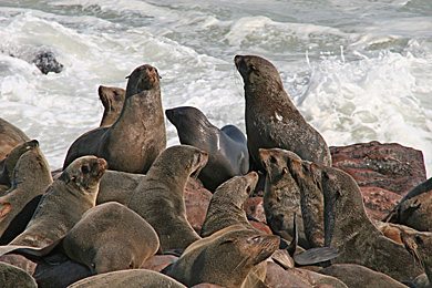 Dennoch erreichten wir Cape Cross nur 10 Minuten nach der Öffnungszeit (10:00 h). Der Portogiese Diego Cão war 1486 der Erste, der an der rauen Küste Südwestafrikas anlandete. Nach Entdeckersitte ließ er ein Steinkreuz aufstellen. Heute stehen dort zwei, ein deutsches aus der Kaiserzeit und eine originalgetreue Kopie des portugiesischen Originals; denn das Original verschwand im Berliner Zeughaus. Die eigentliche Attraktion von Cape Cross ist aber die dortige Ohrenrobbenkolonie. Bis zu 50.000 Tiere wurden hier bereits gezählt. Die Kolonie ist deswegen so groß, weil hier der Planktongehalt des Benguela-Stroms für Fischreichtum sorgt. Die felsige Landzunge und Kieselsteinstrände machen diesen Platz zusätzlich attraktiv. Hier bot der stürmische, ablandige Wind einen Vorteil, das sonst übliche Getöse und der Gestank der Robben wurden aufs Meer anstatt in unsere Nasen und Ohren geweht.