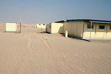 Das Prozedere am Eingangstor zum Skeleton National Park erwies sich als etwas umständlich. Es mussten 3 Formulare mit nahezu identischem Inhalt ausgefüllt werden. Der sehr freundliche Torwächter ließ es sich auch nicht nehmen, diese Arbeit mir größter Sorgfalt und einer Geschwindigkeit von 3-4 Buchstaben pro Minute selbst zu erledigen. Die Strecke erwies sich als trostlos. Ein Wrack bekamen wir auch nicht zu Gesicht. War keins da? Waren die Hinweisschilder versandet oder waren wir nur durch die Eintönigkeit erblindet? Etwas Abwechslung trat nur ein als wir ein Diamantensperrgebiet passierten. Hier wurden wir strengstens ermahnt: "Nicht anhalten! Nicht aussteigen! Nichts aufheben!" (Ob es Leute gibt die während der Fahrt sich aus der geöffneten Türe lehnen und Diamanten aufsammeln?)