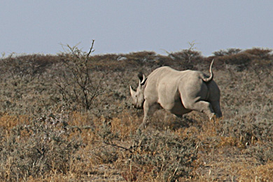 Am Nachmittag drehten wir dann eine östliche Runde über Gemsbokvlakte, Olifantsbad, Aus, Kapupuhedi, Nebrowni. Wieder konnten wir nur über den Tierreichtum staunen. Nur Löwen hatten wir nicht zu Gesicht bekommen, so sehr wir auch Ausschau hielten. Plötzlich erahnten wir mehr, als wir hinter einer langgezogenen Buschkette sehen konnten, wild rennende Zebras. Frauke rief aufgeregt: "Die werden von einem Löwen gejagt!". Wir versuchten vorsichtig parallel zu bleiben, bis urplötzlich kein Löwe sondern ein Nashorn durch eine Buschlücke brach und 20 m vor unserem Auto in einem Affenzahn die Straße überquerte. Wir waren so erschrocken, dass wir die Kameras nicht schnell genug hoch bekamen und fast nur noch das Hinterteil ins Bild bekamen.