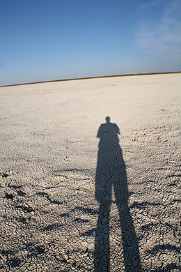 Unser letzter Besichtigungspunkt war der "Etosha Lookout". Ein einsamer Oryx überquerte die Salzpfanne. Als der in der Ferne verschwunden war, weit und breit kein Tier zu sehen war, etwas entfernt eine Reisegruppe ihren Bus verlassen hatte, wagten auch wir kurz den Ausstieg.