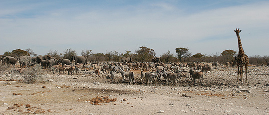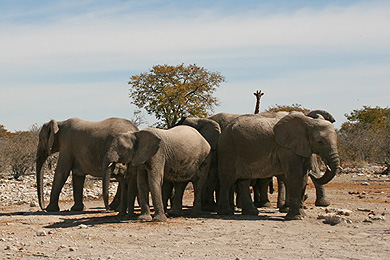 Nach dem Frühstück packten wir unsere Sachen und machten uns wieder auf in den Park. Wieder nahmen wir den Weg über die Wasserlöcher Gemsbokvlakte, Olifantsbad und Aus, um dann über Oudongab, Homob, Sueda, Salvadora, Charitsaub und Rietfontein nach Halali zu fahren. Nicht zu zählende Zebras, Gnus, eine Elefantenherde, die vor und die Straße kreuzte um sich dann am Wasserloch zu laben, Warzenschweine, Giraffen soweit das Auge Auge reichte.