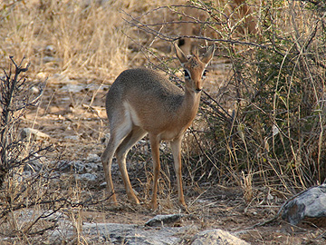 Da sich der Tag langsam dem Ende näherte, fuhren wir Richtung Tor, bogen dann aber nochmals zum Wasserloch Klein Namutoni ab. Welch ein Glück! Denn hier labte sich eine Löwin, beobachtet von Perlhühnern und - in gebührendem Abstand - von einer Giraffe. Als die Löwin genug getrunken hatte, drehte sie sich um und ging gemächlich zurück in den Busch. Erst als sie den Buschrand erreicht hatte, spreizte die Giraffe ihre Beine und trank (gefährlichste Stellung für Giraffen). Etwas weiter entfernt stand immer noch abwartend eine Herde von 9 Giraffen, denn die Löwin war immer noch in der Nähe. Als wir bei der Weiterfahrt eine Lichtung passierten, stand sie dort, als ob sie auf uns gewartet hätte. Schaute uns an, bis wir unsere Fotos gemacht hatten, und verschwand dann königlich im Gebüsch. Am Dikdik Drive lief uns erst wieder eine Sippschaft an Perlhühner über den Weg, dann ignorierte uns ein Wollkopfgeier in einem abgestorbenen Baum und zum krönenden Abschluss des Etosha Parks bekamen wir noch einige der sehr scheuen Damara Dikdiks zu sehen.