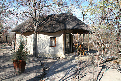 Genau mit Sonnenuntergang verließen wir den Park über das Von Lindequist Gate. Nach 7 km bogen wir in die 10 km lange Pad zur Etosha Aoba Lodge ein, für die wir 30 Minuten brauchten, da sie eng durch einen "Wald" verlief und es inzwischen stockdunkel geworden war. Nach 197 Tageskilometern wurden wir von Margret recht nett mit einem Begrüßungstrunk empfangen. Die Häuser sind einfach aber sauber und wie die gesamte Lodge von Bäumen umgeben - ein krasser Gegensatz zum Park. Das Abendessen (Salat, Huhn mit Spinatfüllung, Teramisu) wurde im Freien mit Blick auf ein sehr kleines beleuchtetes Wasserloch, wo sich ein paar Impalas und ein Hase zeigte.
