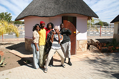 Während Frauke nach unserem kurzen Hauptstraßenrundgang ein Internetcafé aufsuchte, machte Fried sich auf die Suche nach dem Arts Performance Center der Schweizerin Lis Hidber. Er hatte im Internet gelesen, dass nach den Erfolgen der APC in Oshikuku und Omagalanga der Stadtpräsident von Tsumeb ein großes Grundstück zur Verfügung gestellt hat mit der Bitte, hier ebenfalls ein APC für Straßenkinder und arbeitslose Jugendliche zu gründen. Die im Internet angeführte Adresse stellte sich zwar als die Privatanschrift von (der nicht anwesenden) Lis Hidber heraus, doch Nachbarn konnten ihm mit Händen und Füßen den Weg ein paar Querstraßen weiter weisen (siehe Infokasten). Auch hier war das Büro verschlossen, so dass er der zuhörenden Musik folgte. Als Fried erklärte, dass er im Internet Ausschnitte aus ihrer CD mit Marimba-Musik gehört hätte und nun gerne diese CD kaufen würde, war man etwas ratlos; denn die Leitung war wohl abwesend. Doch man machte sich flugs auf die Suche nach einem Exemplar. Zurück kam man nicht nur mit einer CD sondern auch mit einem Player, denn vor dem Verkaufen wurde erst überprüft, ob die Scheibe auch funktionierte. Inzwischen waren noch einige junge Afrikaner dazu gekommen und Fried fragte, ob er ein Gruppenfoto von Ihnen machen dürfte. Das wurde strahlend akzeptiert und anschließend erhielt er als Dank für sein Interesse ein kleines Privatkonzert. Man konnte sehen, dass diese jungen Leute Spaß an der Musik haben.