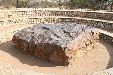 Auf dem Weg nach Grootfontein war für mich als Metallurge natürlich eine Besichtigung des Hoba-Meteoriten eine Pflichtübung. Er enthält ungefähr 82,4 % Eisen, 16,4 % Nickel und 0,76 % Kobalt. Andere in ihm enthaltenen Spurenelemente sind Kohlenstoff, Schwefel, Chrom, Kupfer, Zink, Gallium, Germanium und Iridium. Wissenschaftlich wird er als nickelreicher Ataxit bezeichnet. Er ist beinahe 3 m lang und bis zu 1 m dick. Trotz seines Gewichtes von 55 t soll das Ungetüm bei seinem Einschlag vor 80.000 Jahren keinen Einschlagkrater hinterlassen haben - ein Phänomen, das bis heute nicht geklärt werden konnte. Na ja, auf jeden Fall muss man sich hier keine Sorgen machen, dass den mal schnell ein Tourist als Souvenir mitnimmt.