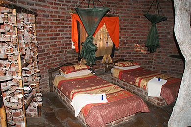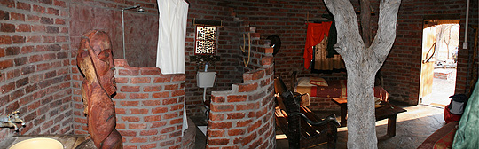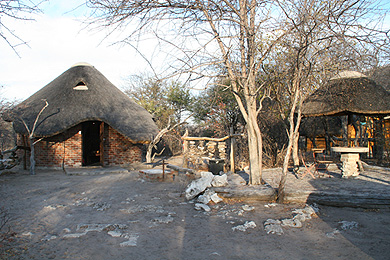 In Grootfontein füllten wir nur unsere Wasservorräte auf, danach ging´s weiter auf der B8 Richtung Rundu. Direkt an der Abzweigung der C44 bogen wir links ab zu Roy´s Camp, wo wir eine Unterkunft für 2 Nächte gebucht hatten. Zunächst spülten wir mit einem leckeren Savannah Dry (oder waren es mehrere?) die 266 Kilometer dieses Tages herunter, bevor uns Heinrich eine rustikale 1-Raum-Rundhütte zuwies. Die Dachkonstruktion der Hütte wurde mehr oder weniger durch einen abgestorbenen Baumstamm in der Raummitte getragen. Das Waschbecken war offen im Wohn-Schlafbereich, Dusche und WC allerdings durch eine brusthohe Mauer etwas abgetrennt. Afrikanisches Buschfeeling pur!