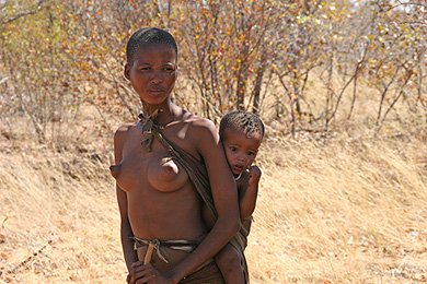 Der "Action Day" war ein Erlebnis. Als Erstes zeigten sie uns wie man primitiv durch Reibung Feuer macht, denn Feuer brauchten sie für ihre Pfeifen und die waren praktisch im Dauereinsatz. Uns fiel auf, dass die San fast permanent husteten. Wir führten das zunächst aufs exzessive Rauchen zurück. Doch später hörten wir, dass TB unter den Buschleuten sehr verbreitet sei und sie dagegen vom Staat Medikamente erhielten. Dann führten sie uns in den Busch. Sie bauten eine Vogelfalle auf und führten uns ihre Funktionsweise vor. Dann zeigten sie uns wie sie mit Pfeil und Bogen auf Jagd gehen. Nach getaner Arbeit wurde wieder Feuer gemacht, eine Pfeife angezündet und rundum gereicht. Gott sei Dank boten sie sie uns nicht auch an. Heute rauchen die San Tabak, früher verqualmten sich u.a. Hasenkötel (norddeutsch für Kotklümpchen vom Hasen). Interessant war die Pfeife selbst. Sie besaß wie bei uns zwar einen Stil, doch gezogen wurde durch den dicken Pfeifenkopf, an dessen unteren Seite eine Höhlung für den Tabak war.