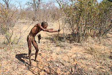 Während des Buschrundganges hatte man uns erklärt, aus welchen Materialien (Zweige usw.) sie Pfeil und Bogen machten. Nun fertigten sie einen für uns. Zuerst wurde die Sehne auf den Männerschenkeln gerollt, dann der Bogen geschnitzt. Dass alles wurde von einem älteren San mit monotonem Gesang und Ding-Dong-Ding-Dong auf einer Leier musikalisch begleitet. Schließlich musste der Bogen ausprobiert werden, zuerst von ihnen und dann natürlich von uns. Nach dem wir auch die Übung geschafft hatten, wurde uns Pfeil und Bogen feierlich als Geschenk überreicht.