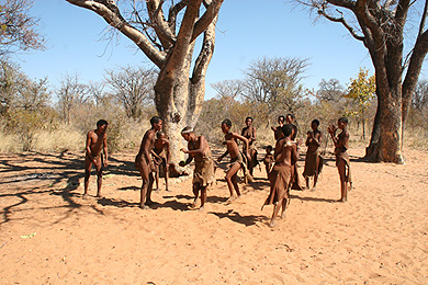 Anderen Besucher an diesem Tag hatten wohl kürzere Programme gewählt, denn die Zahl an Buschleuten um uns herum nahm immer mehr zu. Als Nächstes führten sie uns ihre Spiele zum Zeitvertreib vor. Bei einem Ballspiel liefen die Buschfrauen umher und warfen, sich den Ball zu, wobei der nicht auf die Erde fallen durfte. Nach einer gewissen Zeit sprang ein Buschmann in den Kreis und versuchte den Ball abzufangen. Als ihm das gelungen war, war das Spiel beendet. Danach führten sie einen Ringeltanz auf, der z.B. bei Besuch aus anderen Dorfgemeinschaften getanzt wird.