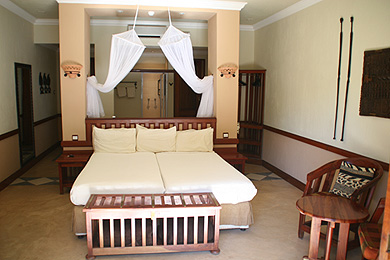 Gegen halb drei trafen wir in Kasane in der Chobe Safari Lodge ein, in der wir für die nächsten 2 Nächte eines der neuen Safarizimmer gebucht hatten. Das Einchecken ging bei einem Begrüßungstrunk problemlos, ebenso die anschließende Fixierung der Pirschfahrt am nächsten Morgen von 6 - 9 Uhr (Alternativen: 10 - 13 und 15 - 18 Uhr) und der Bootsfahrt am nächsten Nachmittag von 15 - 18 Uhr - für die wir bereits Vouchers besaßen - sowie die Buchung des Transfers nach Kasane am übernächsten Tag. Das Gepäck wurde uns selbstverständlich aufs Zimmer gebracht. Das neue Safari-Zimmer war das beste was wir bislang hatten, mit einem freistehenden Bett von dem man direkt auf den Chobe River blicken konnte. Wir hatten das Glück, dass unser Zimmer im Erdgeschoß des zweistöckigen Gebäudes lag und wir so direkt über die Terrasse in den Gartenbereich und an den Fluss gelangten.