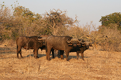 Um Viertel nach fünf standen wir auf (und das im Urlaub !!!), denn um sechs begann die Pirschfahrt. Die Formalitäten am Parkeingang erledigte unser Fahrer. Kaum kamen wir unten am Chobe-Ufer an, ein Aufschrei von ihm: "Ein Leopard!" Doch wir sahen nichts, denn er war schon wieder im Gebüsch verschwunden. Über Funk gab er die Sichtung durch und nach wenigen Minuten waren die Safari-Wagen anderer Lodges bei uns und es begann eine regelrechte Jagd immer um die Buschgruppe herum. Vor einem Baum am Rand der Buschgruppe konnte man Schleifspuren sehen und in der Astgabel hing ein Kudu, die Beute des Leoparden. Wir hatten ihn wohl beim Essen gestört. Unser Fahrer meinte, hierhin käme er wohl erst am Nachmittag zurück. Aber er war sich sicher, dass er noch im Gebüsch sei. Als alle anderen schon aufgegeben hatten und weggefahren sind, kam der Leopard kurz aus einem Gebüsch und huschte ins nächste und dann noch einmal. Nun hatten wir also auch einen Leoparden gesehen. Welch ein Anfang, was sollte noch kommen?