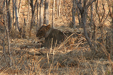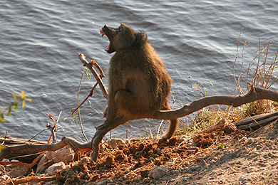 Nun zunächst einmal kam die Sonne. Und mit ihr wurde es zunehmend wärmer. Wir sahen u.a. viele Impalas, (noch) schlafende Elefanten und Wasserbüffel. Gerade beobachteten wir eine Giraffe beim Frühstück, als der Buschfunk quäkte. Eine andere Gruppe hatte Löwen entdeckt, die gerade einen Wasserbüffel verspeisten. Der Standort wurde durchgegeben und nichts wie hin. Ein Löwe war gerade genüsslich am Knabbern und Kauen, während andere in einem Abstand warteten oder schon gesättigt war. Bei einer Kaffee-/Teepause am Chobe hörten wir plötzlich ein großes Geschrei vom Uferbankett. Bei einer Pavianfamilie hing wohl der Haussegen schief, was nicht nur bei Pavianen vorkommen soll. Zum Abschluss sahen wir aus der Ferne eine Hippohorde am Flussufer stehen. Diese Pirschfahrt war ein echtes Erlebnis!