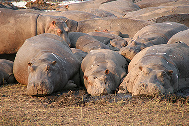 Um 15:00 Uhr starteten wir zur Bootsfahrt auf dem Chobe und bekamen wieder eine Vielzahl an Tieren zu Gesicht, die meisten nur wenige Meter von uns entfernt, wie Wasserbüffel, Krokodile, Hippos, Elefanten, Fischadler, Nimmersatt und viele andere Vögel. Auch den Leoparden bekamen wir - wenn auch in einiger Entfernung von der Flussmitte aus - mit dem Fernglas noch mal zu sehen. Er hing jetzt in "seinem" Baum mit dem gerissenen Kudu. Der Tag neigte sich zu Ende und plötzlich stürzten mehrere Elefantenherden aus dem Busch ans Flussufer für ihren Gute-Nacht-Trunk. Welch ein Anblick, an die hundert Elefanten in Reih und Glied. Natürlich sollte auch diese Fahrt mit einem Sonnenuntergang gekrönt werden. Doch kurz bevor es soweit war, zog starker Dunst am Horizont auf und die Sonne verblasste.