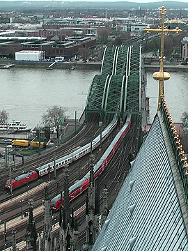 In der Flucht des Domes führt die Hohenzollern Brücke über den Rhein. Sie ist die meist befahrene Eisenbahnbrücke Europas mit einer durchschnittlichen Frequenz von einem Zug pro Minute.